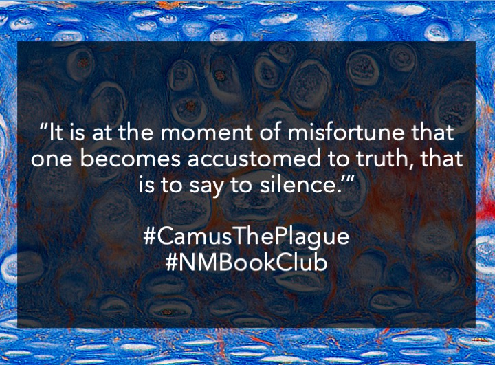 The narrator does interesting work in today’s pages – we disappear into Tarrou’s notebooks, referencing a conversation with Dr. Rieux that we then see in scene a few pages later, again causing us to question who is telling the story. Again the need for “imagination” is raised; Tarrou says, in reference to the Prefecture asking for volunteers to help: “‘What they need is imagination. They never rise to the challenge of a disaster.'” Interesting that we have heard this call now from two different characters. I was moved, too, by the loving interaction between Rieux and his mother, who says, “I don’t mind waiting for you if I know that you will be coming. And when you aren’t here, I think of what you are doing.'” Such a simple statement, but so very touching in this moment.